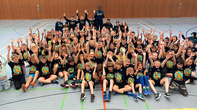 Nach dem Stationstraining ging es dann an jedem Tag mit einem Wettbewerb weiter. Wer kann am schnellsten laufen oder durch den Hindernisparcours rennen? Wer hat die meisten Seilsprünge oder Körbe? In drei Altersklassen wurden täglich die Siegerinnen und Sieger geehrt und am letzten Tag gab es dann ergänzend die begehrten Pokale für die Awards. Außerdem durfte an jedem Tag natürlich ein Basketballspiel oder Turnier nicht fehlen und ebenso ein leckeres Mittagessen in der Mensa der Schule.